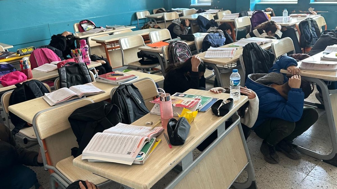 Okulumuzda çalan acil durum zil sesi ile “Çök, Kapan, Tutun” hareketi yapılarak zil sesinin bitmesi beklendi. Zil sesinin bitmesinin ardından öğrencilerimiz, öğretmenlerinin yönlendirmeleriyle tek sıra halinde bulundukları alanlardaki tahliye planını izleyerek, binayı terk edip toplanma alanlarında toplandı.